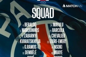 前锋:7-克瓦拉茨赫利亚、 9-贡萨洛·拉莫斯、10-登贝莱、14-杜埃、29-巴尔科拉、49-姆巴耶