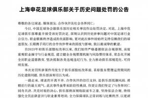 上海申花官方发布《关于历史问题处罚的公告》,表示尊重并接受该处罚决定,向球迷和合作伙伴致以最诚挚的歉意。