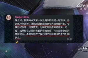 完成体测后,狼队的运动表现副主管史蒂文(Stephen Gilpin)特意用简体中文给徐彬发了一条暖心的私信:“晚上好,很高兴今天第一次见到你和我们一起训练。你训练得非常棒,体能测试数据也是今天组里最好的。今晚好好休息,尽快恢复,为明天的训练做好准备。记住,如果你在训练前需要胡安的理疗,可以在健身房开放前进行。希望你适应了我们的文化和寒冷的天气!明天见!”