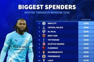 体育资讯2月4日讯 冬季转会窗已经关闭,德国转会市场盘点了足坛各队引援花费情况,曼城以9500万欧居首,水晶宫以9000万欧位居次席。
