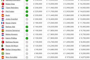 曼城球员薪资排行:(周薪/镑)