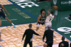 GIF-小凯文·波特进攻肘到皮维面部 回放后普通犯规未升级