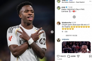 赛后维尼修斯更新社媒,晒出自己庆祝动作并配文写道:“情人节快乐,尽情狂欢吧!”