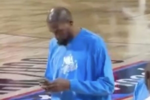 美媒NBA Memes晒出杜兰特在赛场上看手机的照片(不一定是在比赛中),美媒吐槽:杜兰特试图效仿Shams。