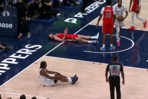 望无大碍!科林斯助攻尼德豪泽暴扣 但自己手臂被撞伤痛苦倒地