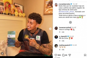 克雷桑在社媒写道:“非常高兴今天在家里收到了Sofascore颁发的2025年度中超联赛最佳球员奖项,非常感激获得认可!所有的荣耀都属于上帝,希望今年能获得更多荣誉。”