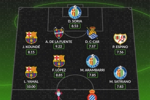 体育资讯3月3日讯 西甲第26轮比赛战罢,WhoScored列出了本轮最佳阵容,亚马尔领衔。