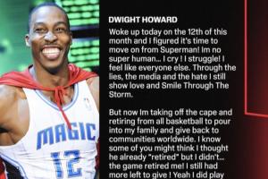 体育资讯03月13日讯 今日,2025年奈史密斯篮球名人堂成员、2004年NBA状元秀、2019-20赛季NBA总冠军&3届DPOY(2009、2010、2011年)&5届NBA一阵(2008-2012年)&4届最佳防守阵容一阵(2009-2012年)&8届全明星(2007-2014年)、5次篮板王(2008、2009、2010、2012、2013年)、2次盖帽王(2009、2010年)、2008北京奥运会金牌得主德怀特·霍华德在自己的个人社媒发布长文宣布退役。