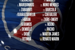 前锋:7-克瓦拉茨赫利亚、 9-贡萨洛·拉莫斯、10-登贝莱、14-杜埃、29-巴尔科拉