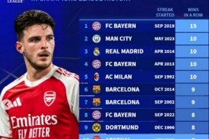 体育资讯1月21日讯 阿森纳本赛季在欧冠豪取7连胜,德转也盘点了欧冠历史连胜纪录榜,具体如下(日期为连胜开始时间):